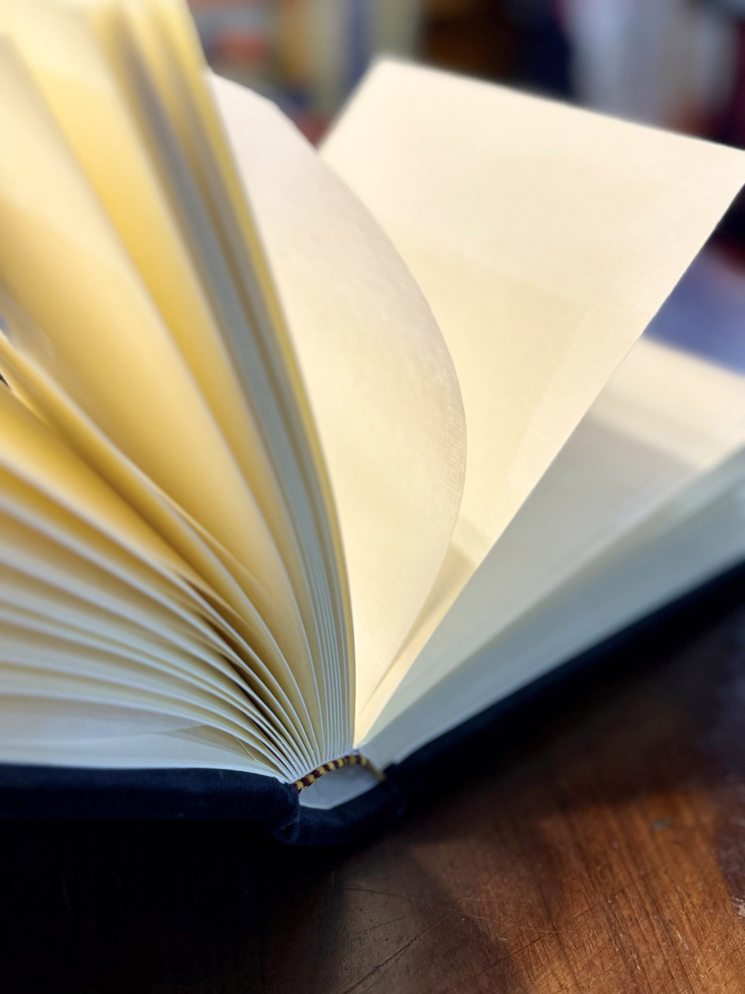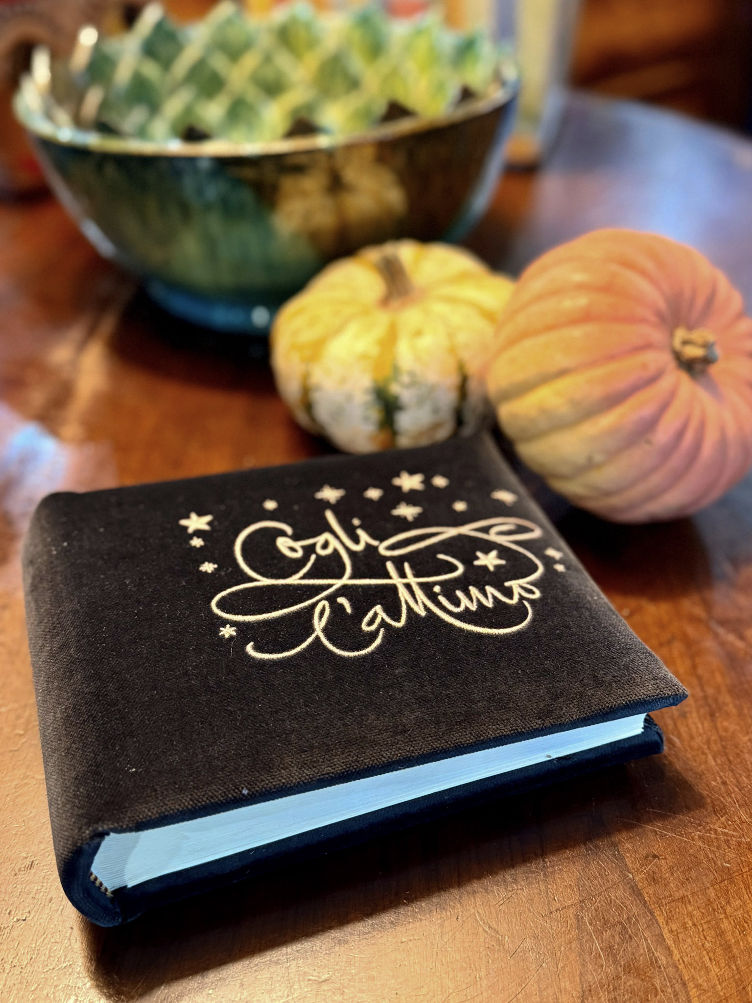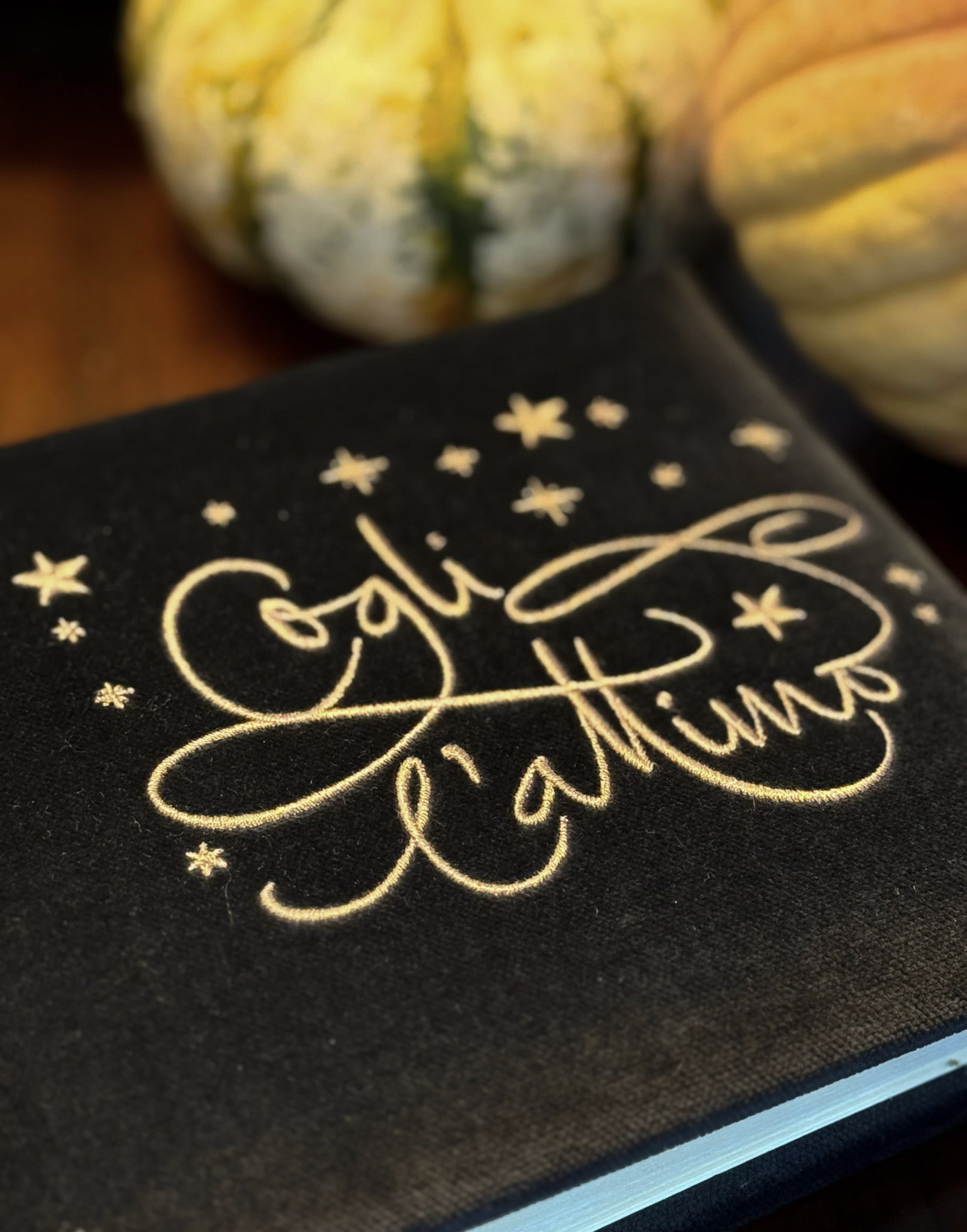 Fodera in velluto nero con ricamo oro “Cogli l’attimo”
