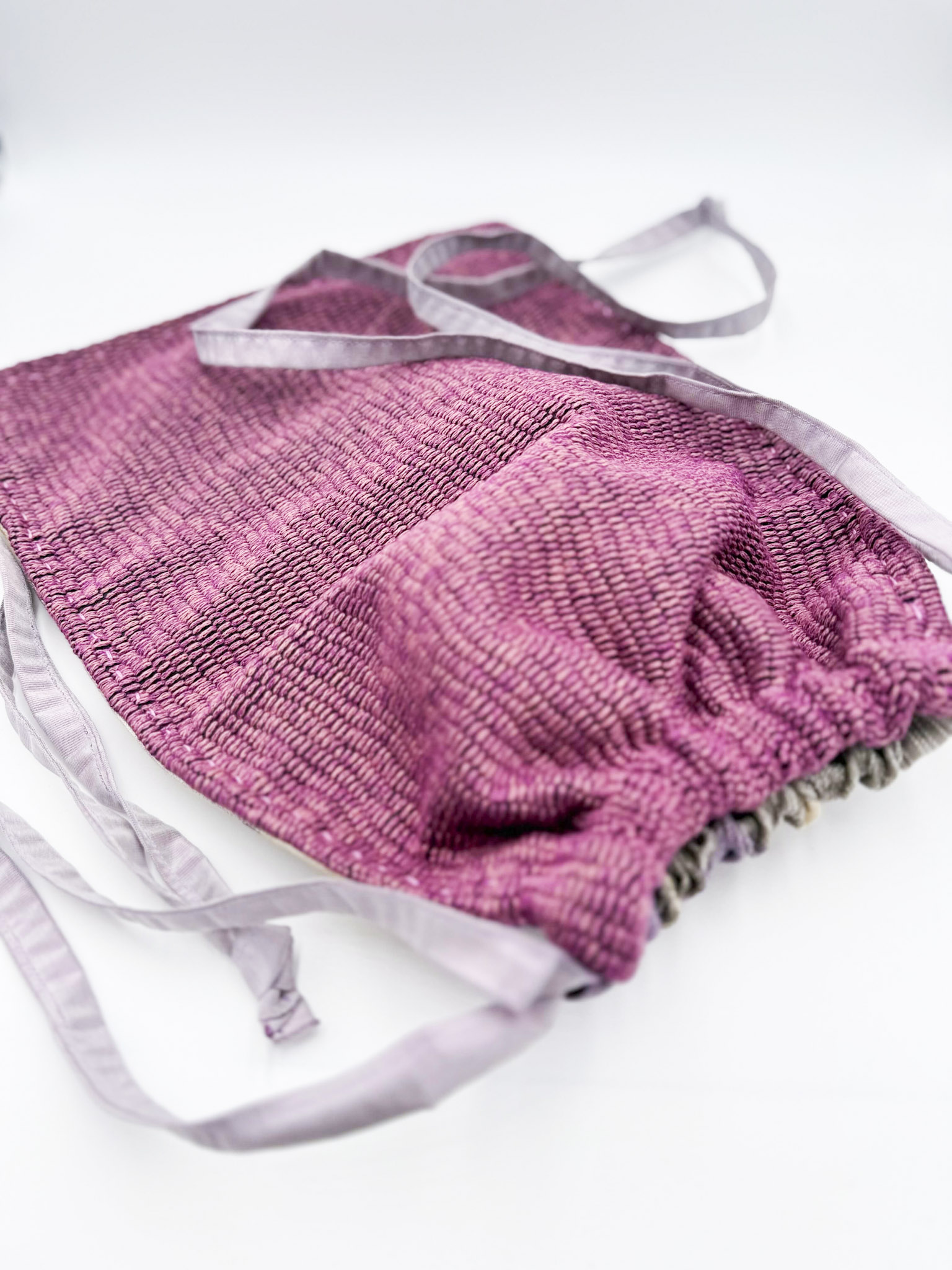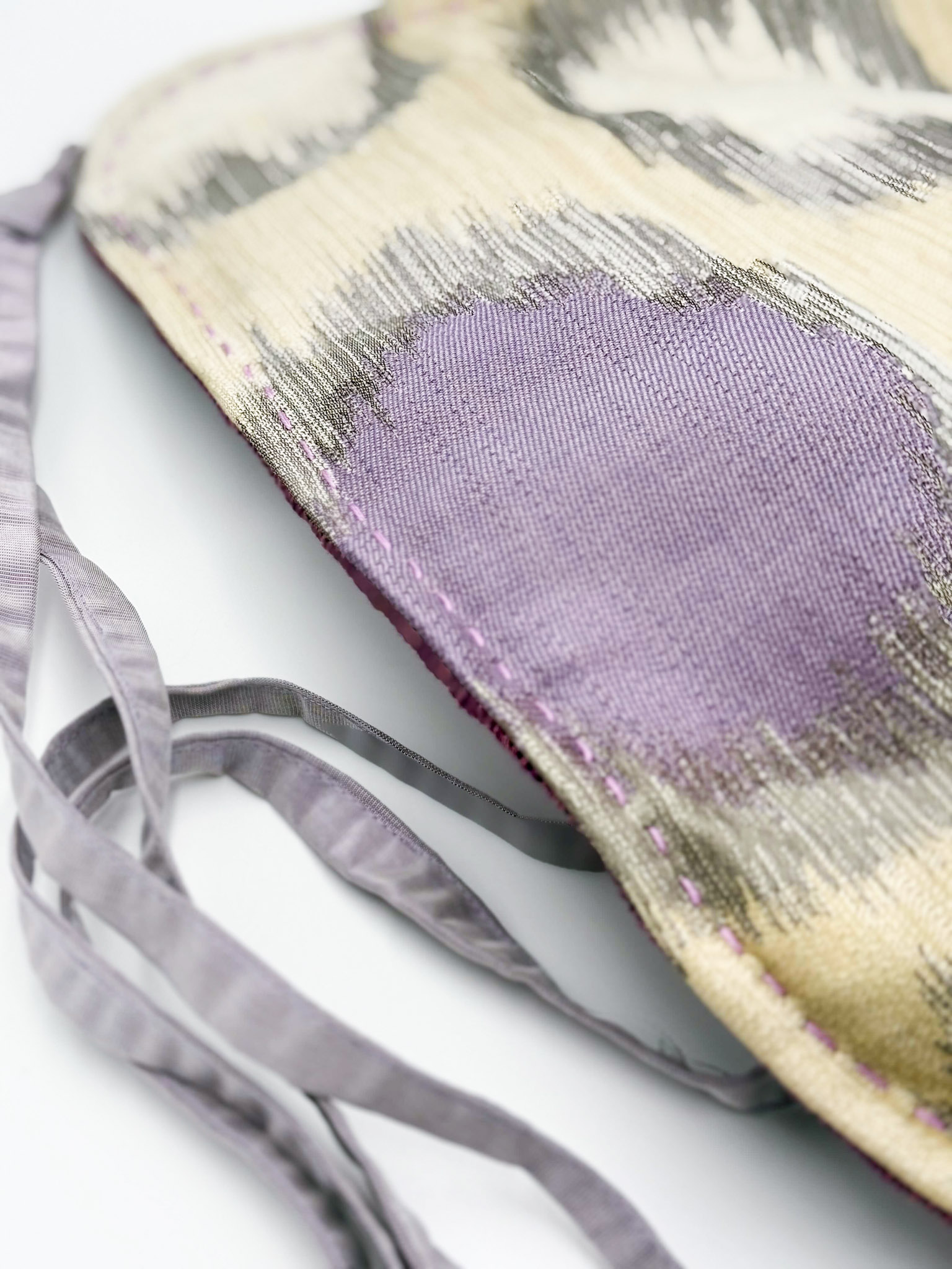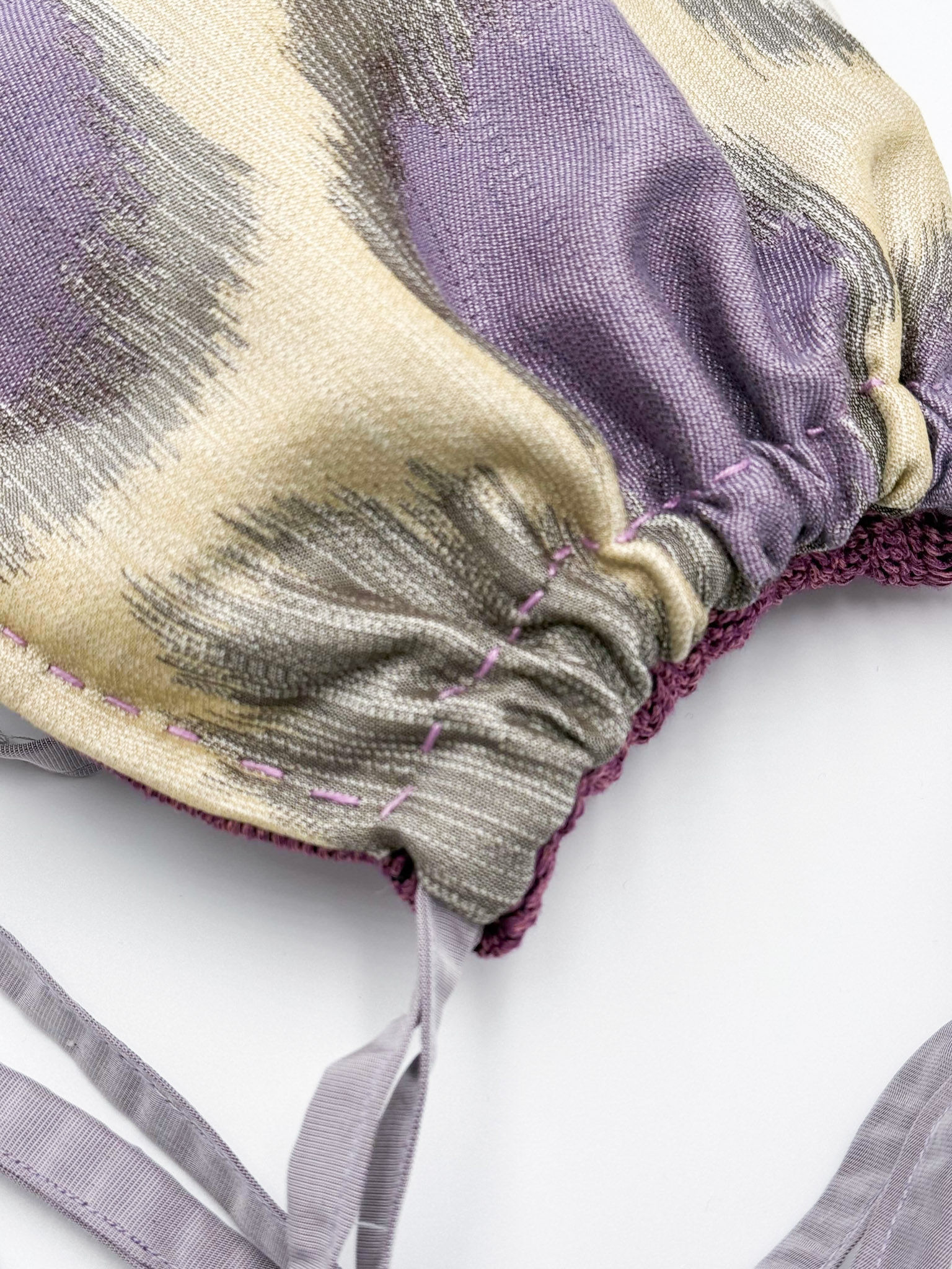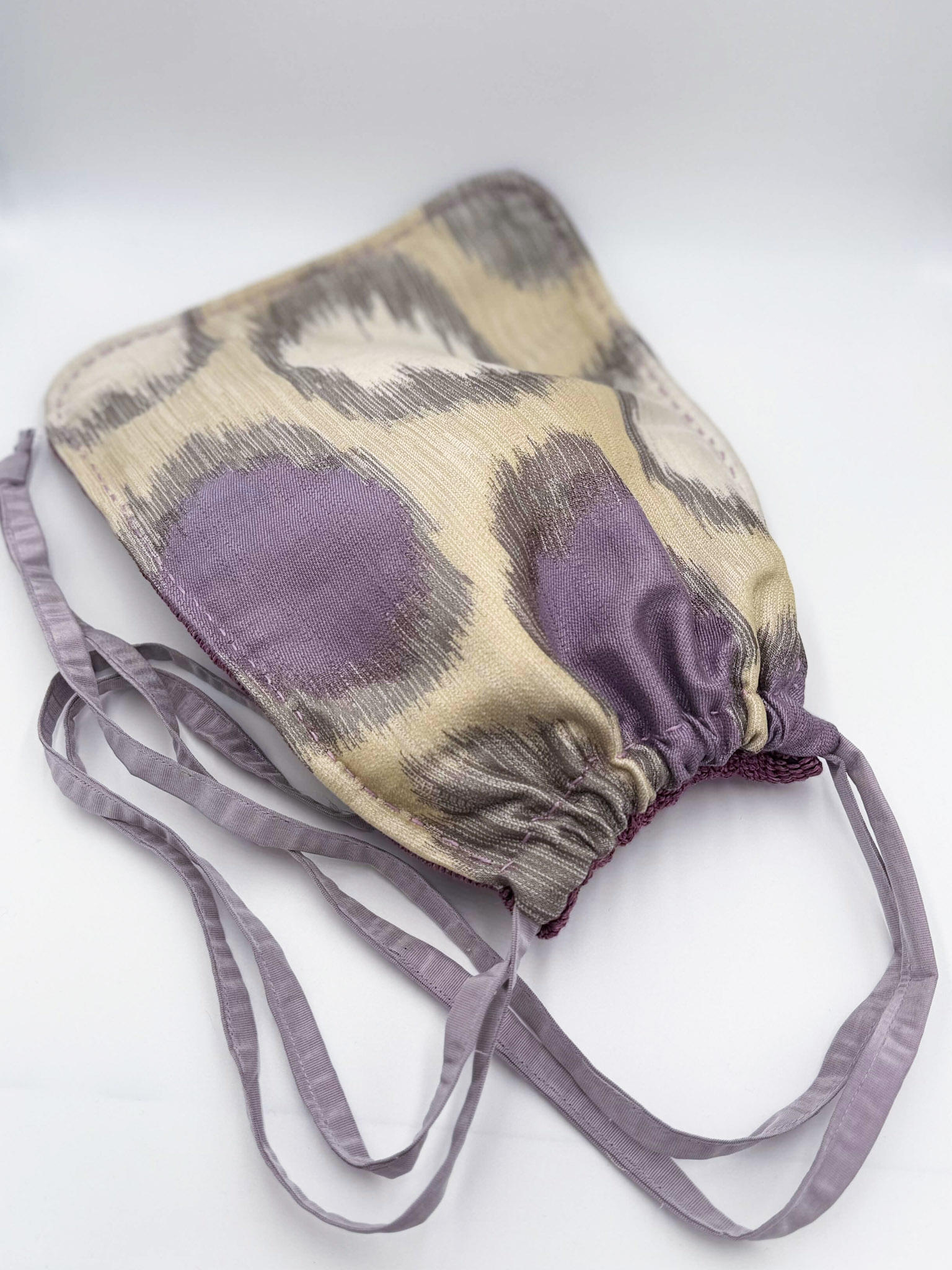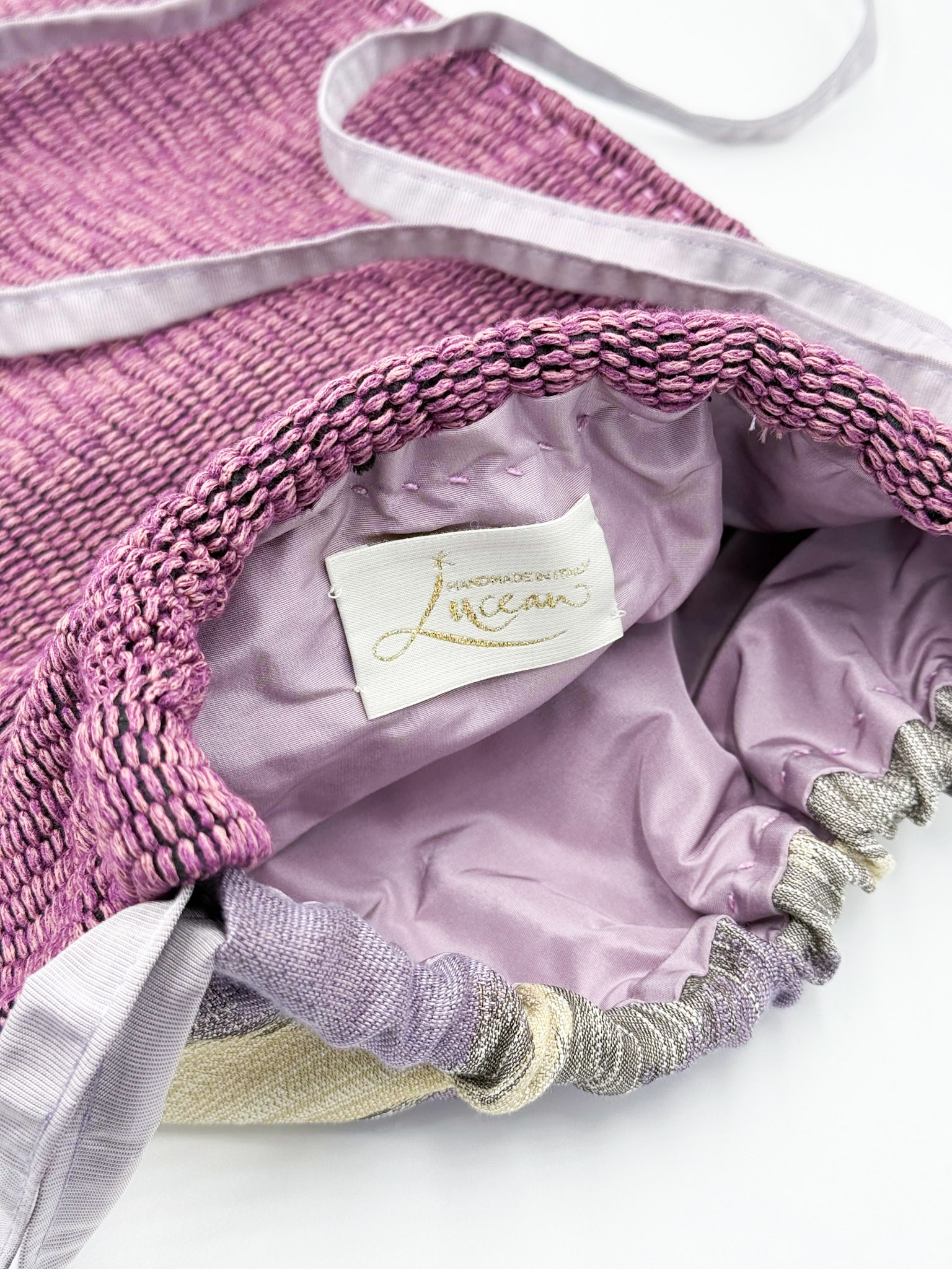 Borsa in lino e seta fantasia cerchi. Cotone viola. Fodera interna e manici in taffetà .